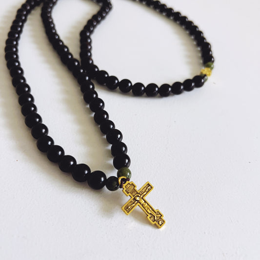 Orthodox Prayer Bracelet - 100 Bead Ebony Wood with Jade Spacers & Gold Crucifix