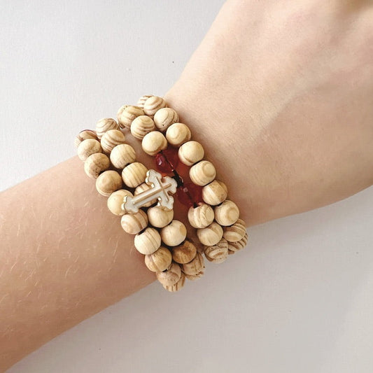 Pulsera de oración de madera de 75 cuentas con cuentas espaciadoras rojas y cruz esmaltada blanca.Precio habitual $19.99 USDPrecio habitualPrecio unitario / por-