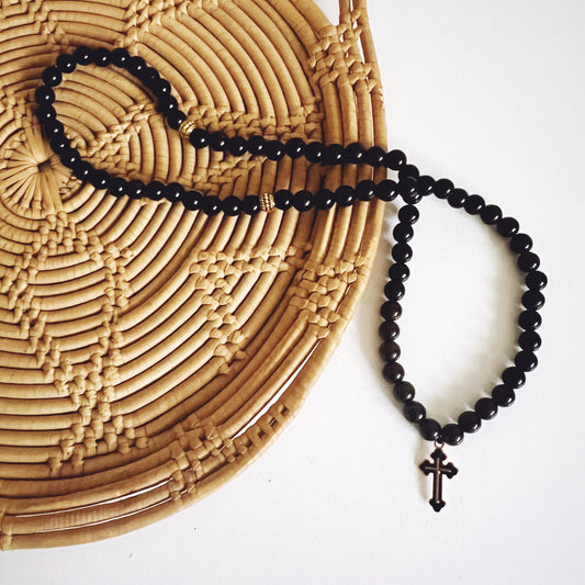 Pulsera de oración de ébano de 75 cuentas con separadores dorados y cruz esmaltada en negro.Precio habitual $19.99 USDPrecio habitualPrecio unitario / por-