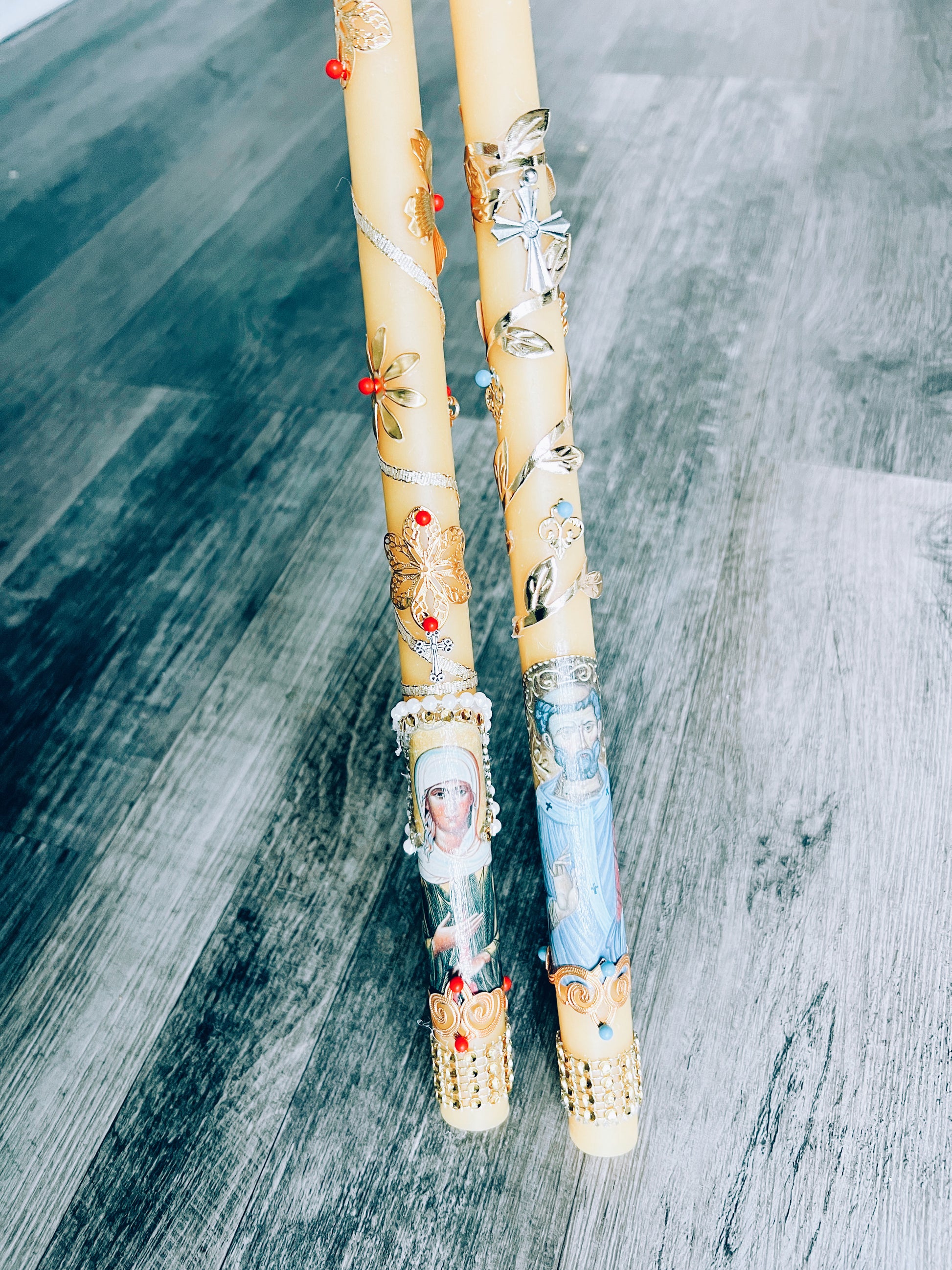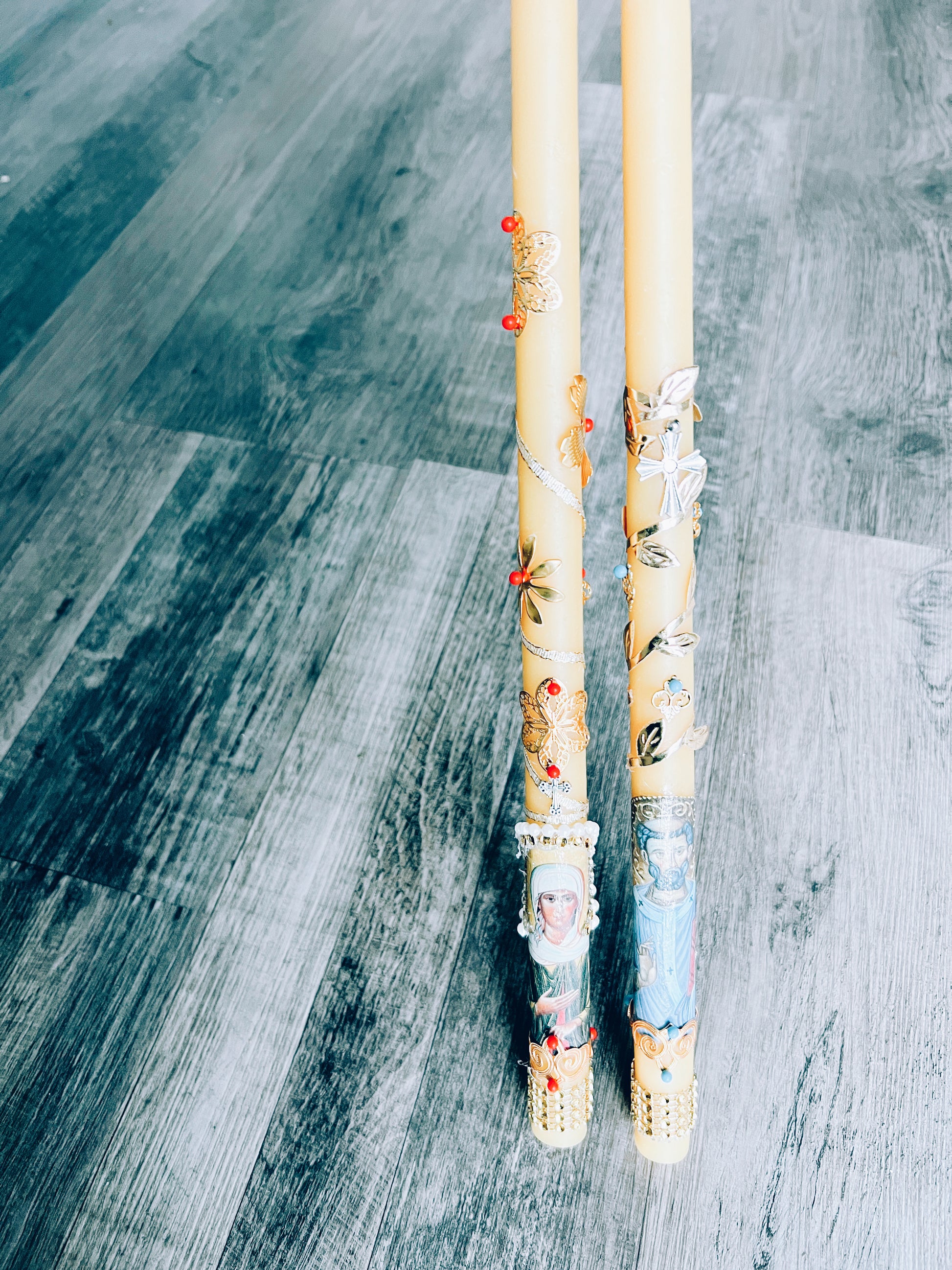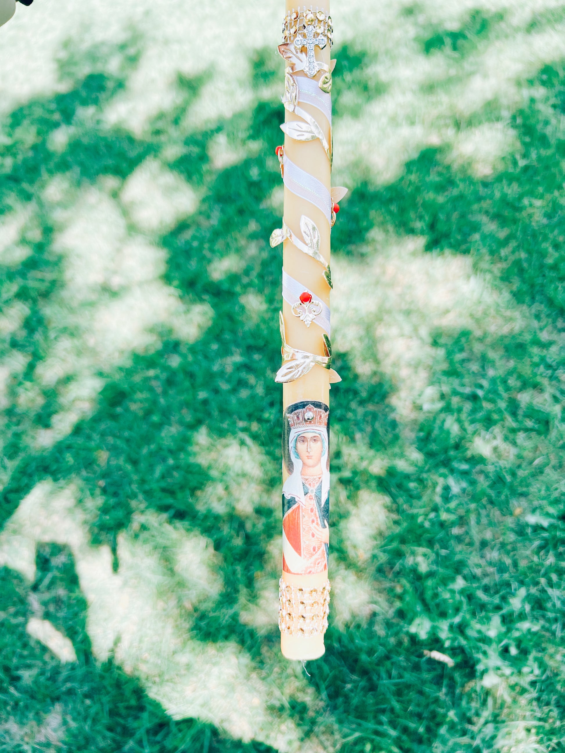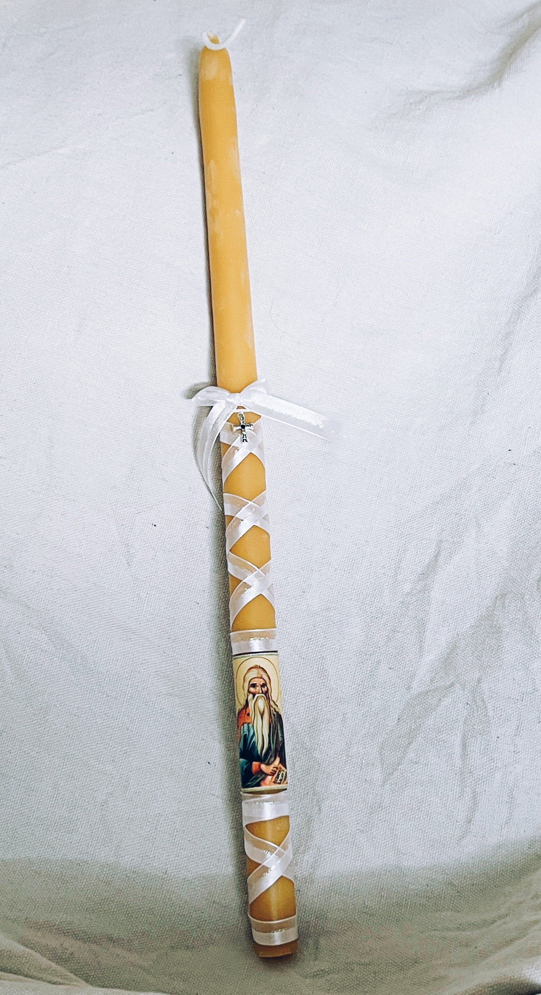 Haga clic aquí para contactarme y solicitar velas personalizadas para su ocasión especial. Todas mis velas son 100 % cera de abeja pura y provienen de diversos monasterios ortodoxos. Miden aproximadamente 33 cm de alto y son lo suficientemente largas como para arder durante todo un servicio litúrgico, además de 40 días adicionales de Divinas Liturgias Dominicales. A continuación, encontrará ejemplos de velas personalizadas que he hecho para otros o para abastecer las librerías parroquiales. Disponemos de velas más pequeñas (más cortas) a pedido.