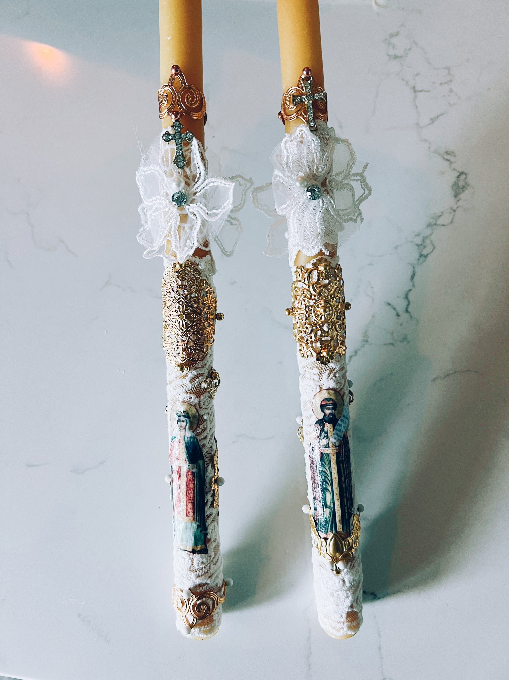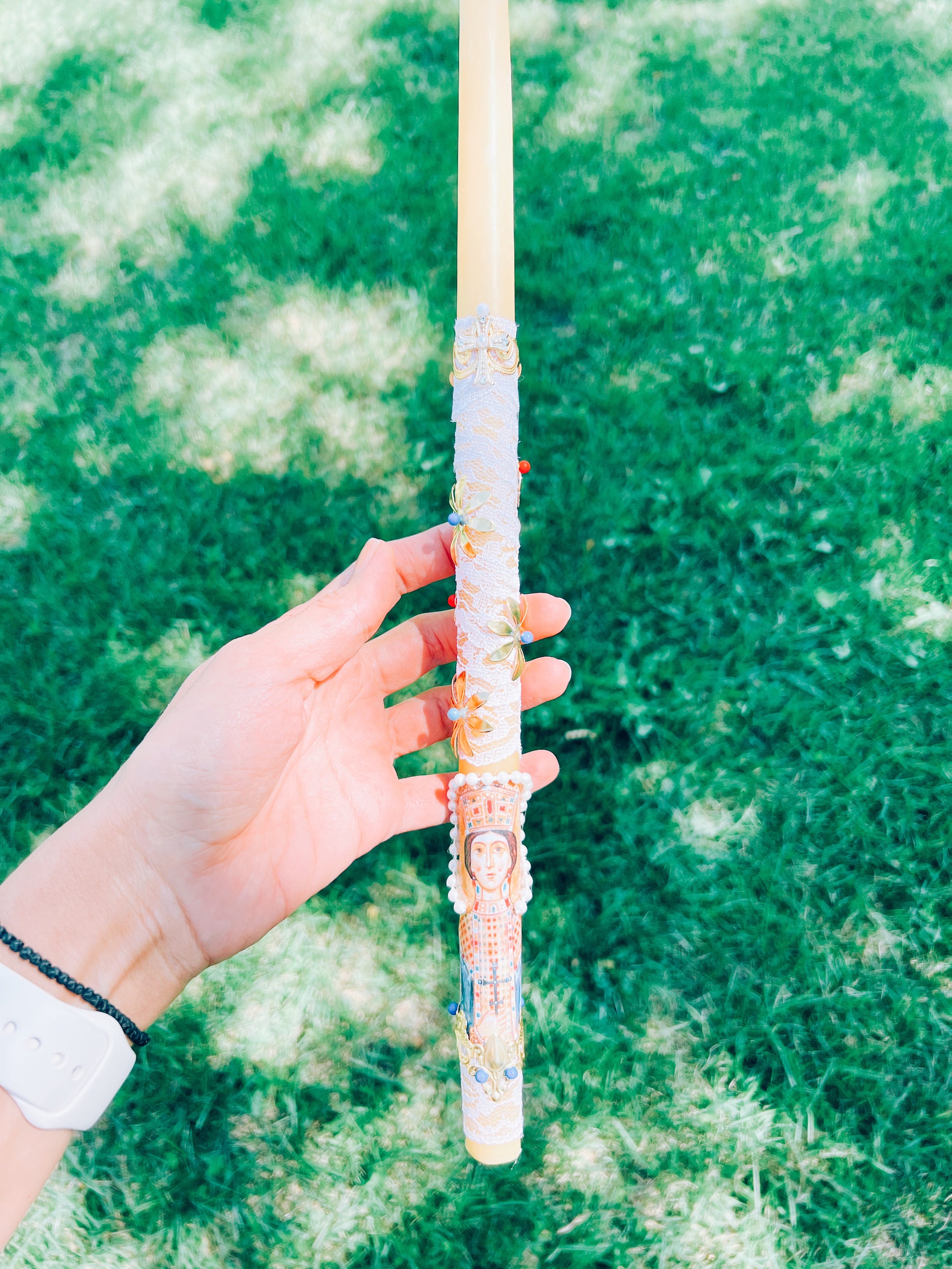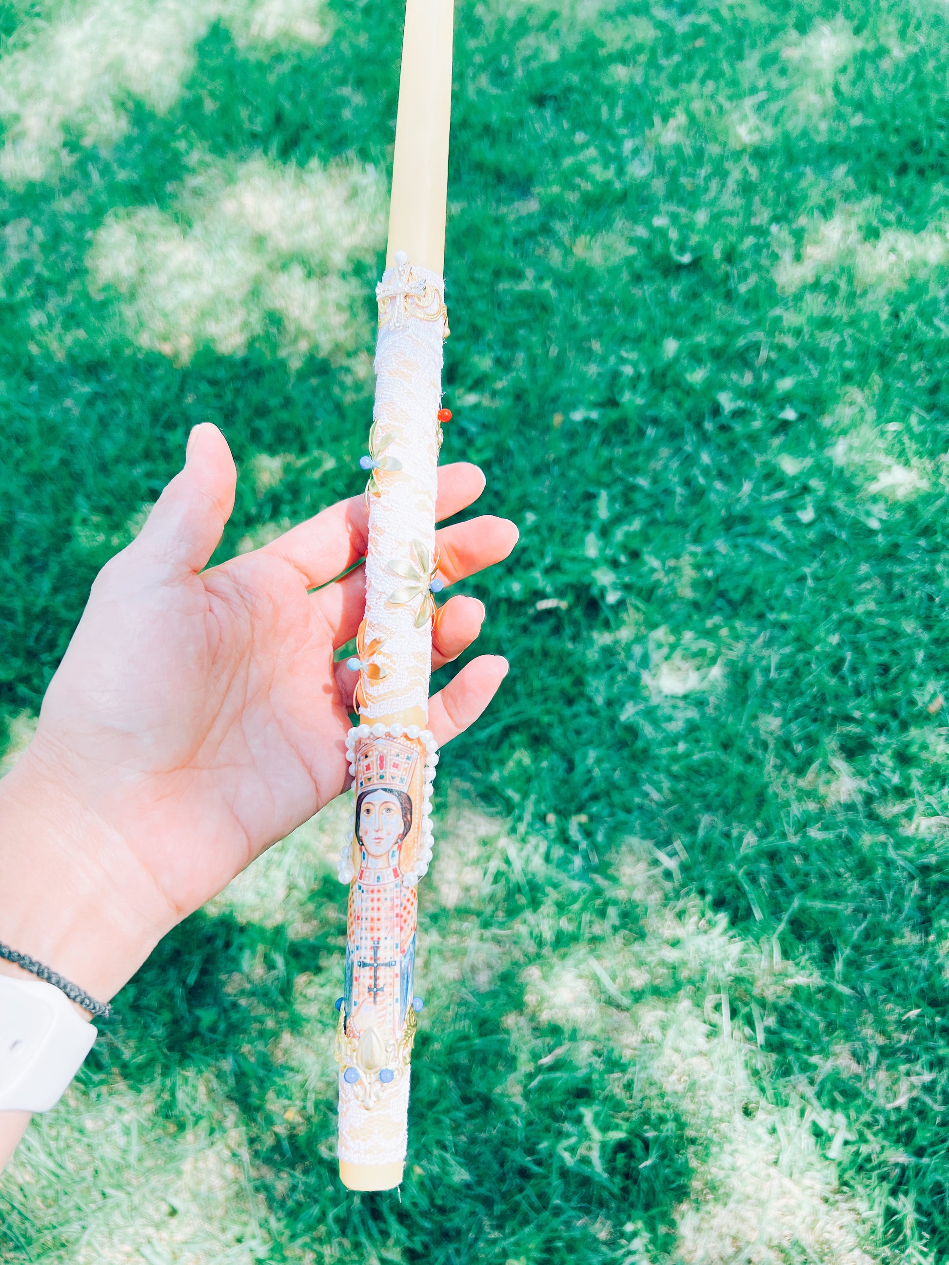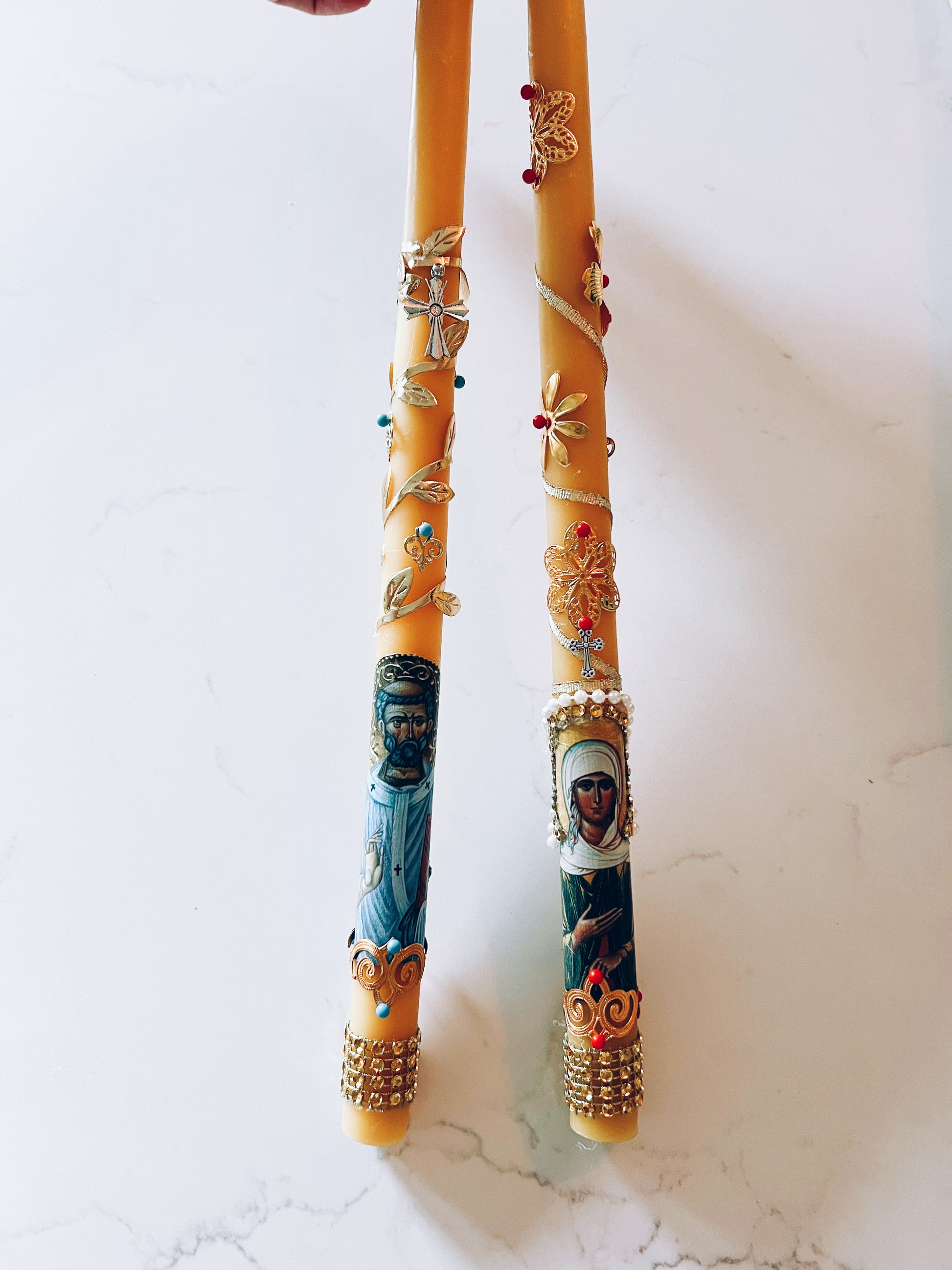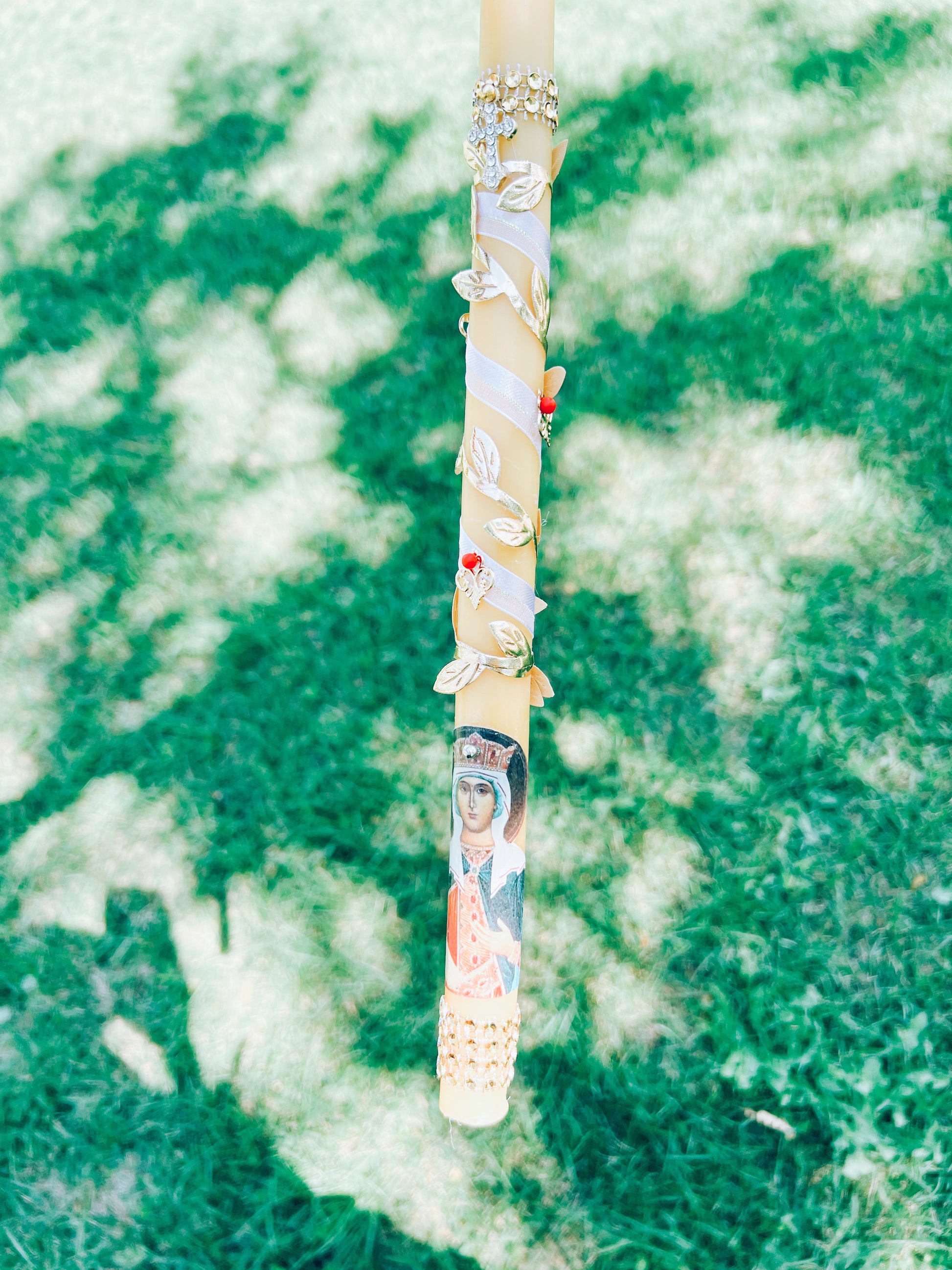 Haga clic aquí para contactarme y solicitar velas personalizadas para su ocasión especial. Todas mis velas son 100 % cera de abeja pura y provienen de diversos monasterios ortodoxos. Miden aproximadamente 33 cm de alto y son lo suficientemente largas como para arder durante todo un servicio litúrgico, además de 40 días adicionales de Divinas Liturgias Dominicales. A continuación, encontrará ejemplos de velas personalizadas que he hecho para otros o para abastecer las librerías parroquiales. Disponemos de velas más pequeñas (más cortas) a pedido.