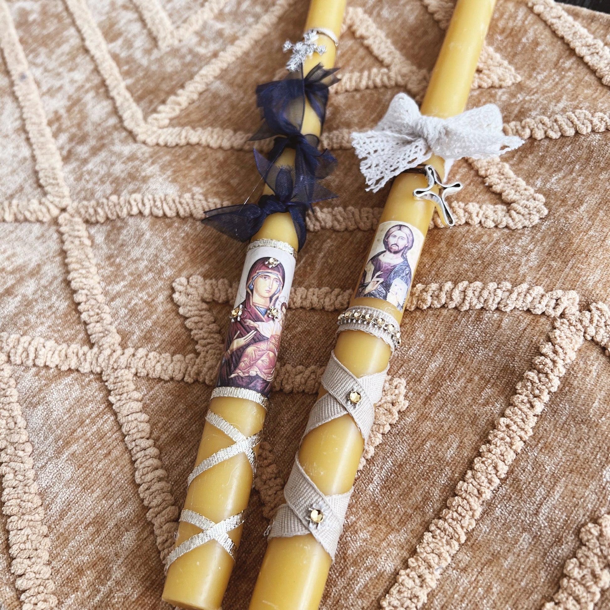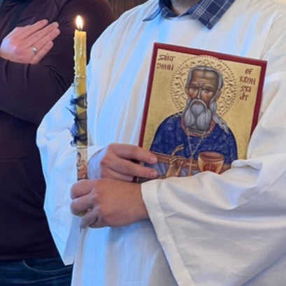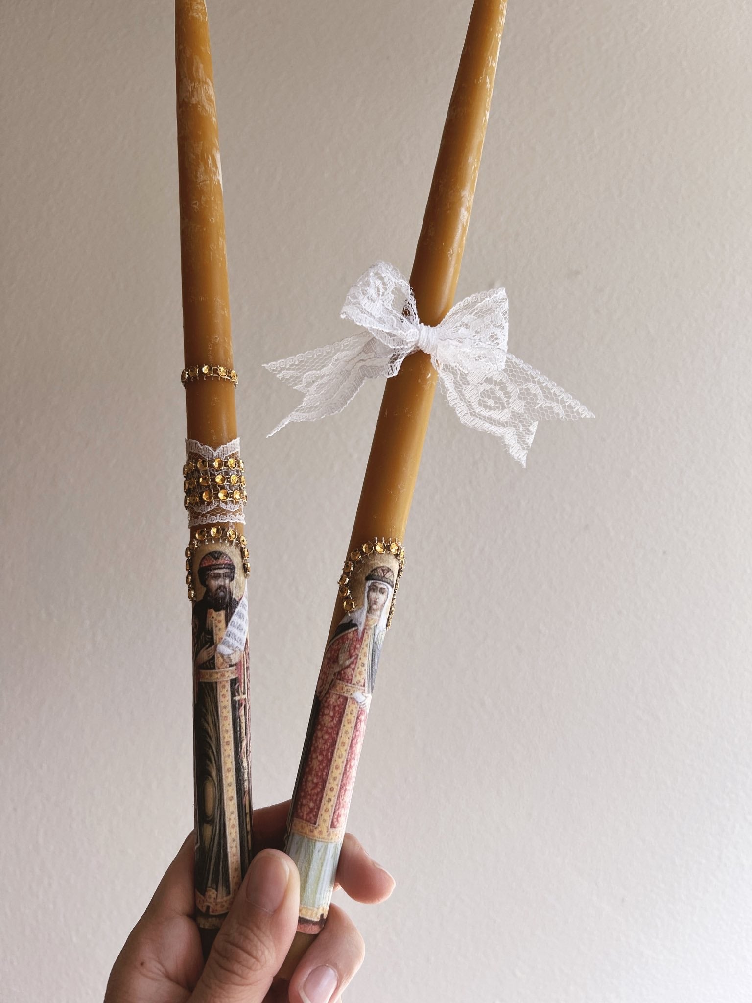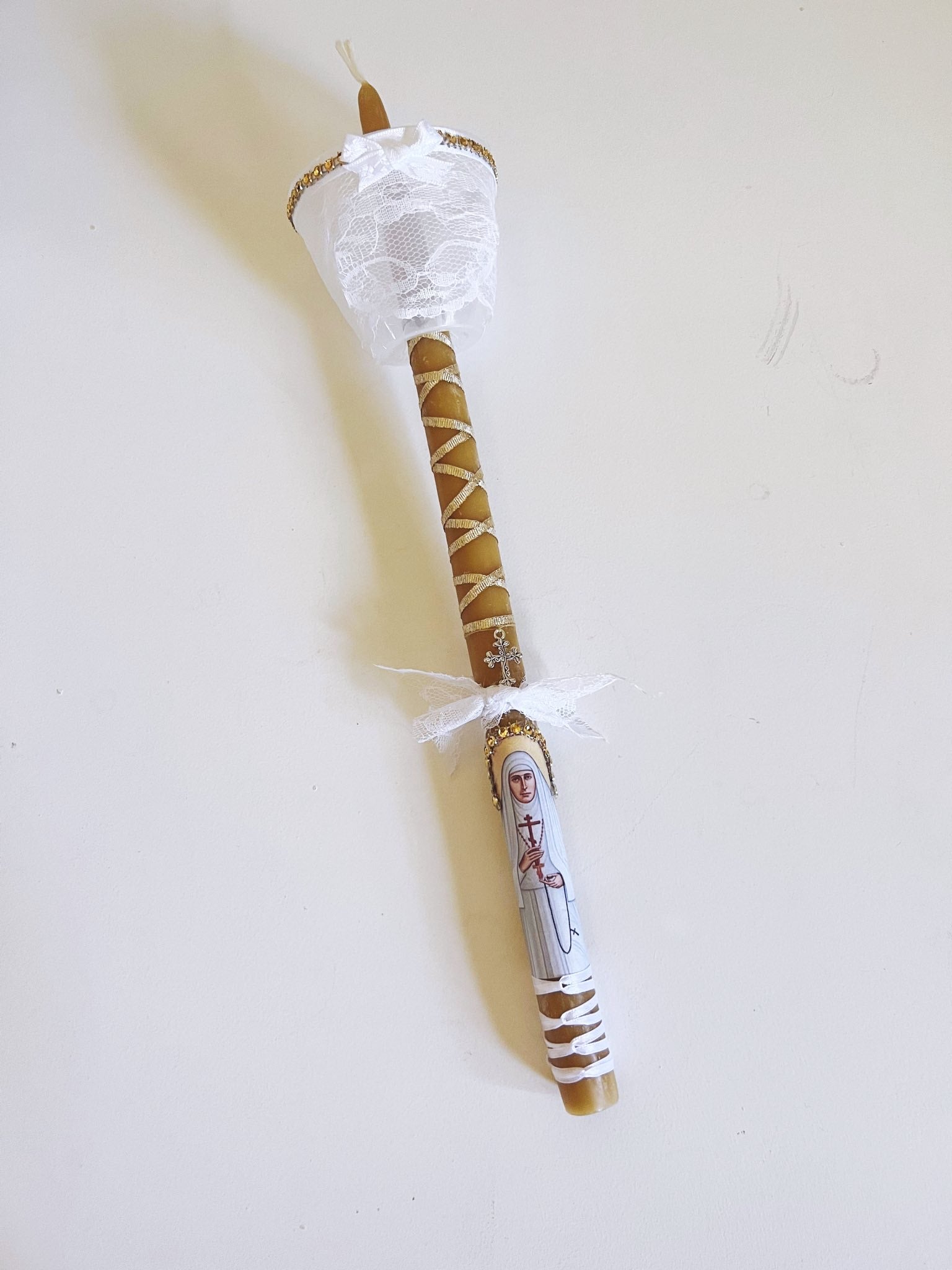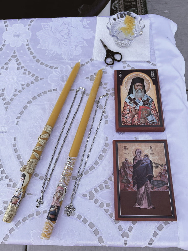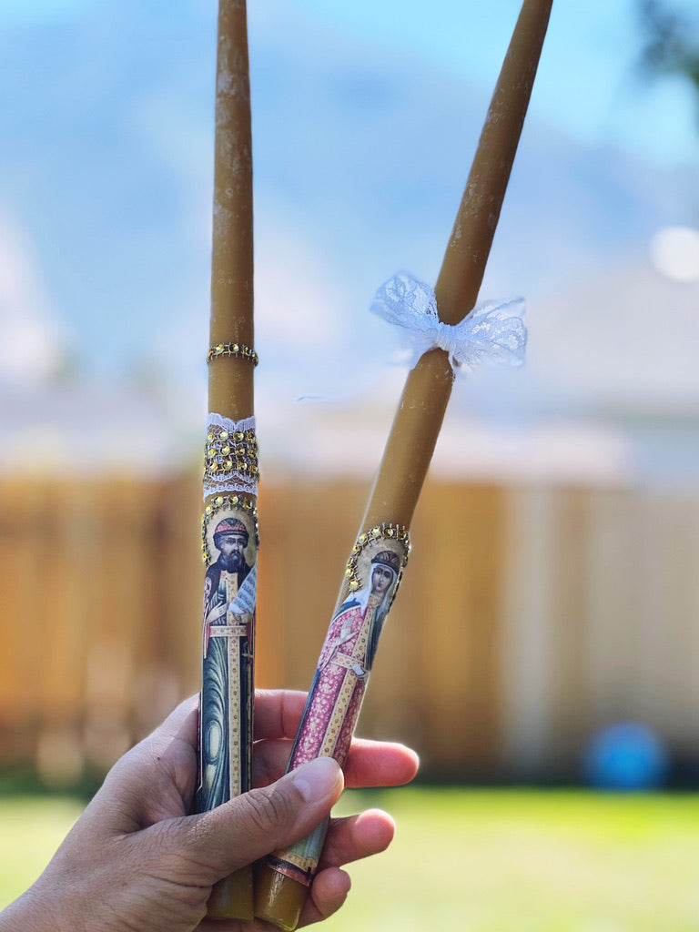 Haga clic aquí para contactarme y solicitar velas personalizadas para su ocasión especial. Todas mis velas son 100 % cera de abeja pura y provienen de diversos monasterios ortodoxos. Miden aproximadamente 33 cm de alto y son lo suficientemente largas como para arder durante todo un servicio litúrgico, además de 40 días adicionales de Divinas Liturgias Dominicales. A continuación, encontrará ejemplos de velas personalizadas que he hecho para otros o para abastecer las librerías parroquiales. Disponemos de velas más pequeñas (más cortas) a pedido.
