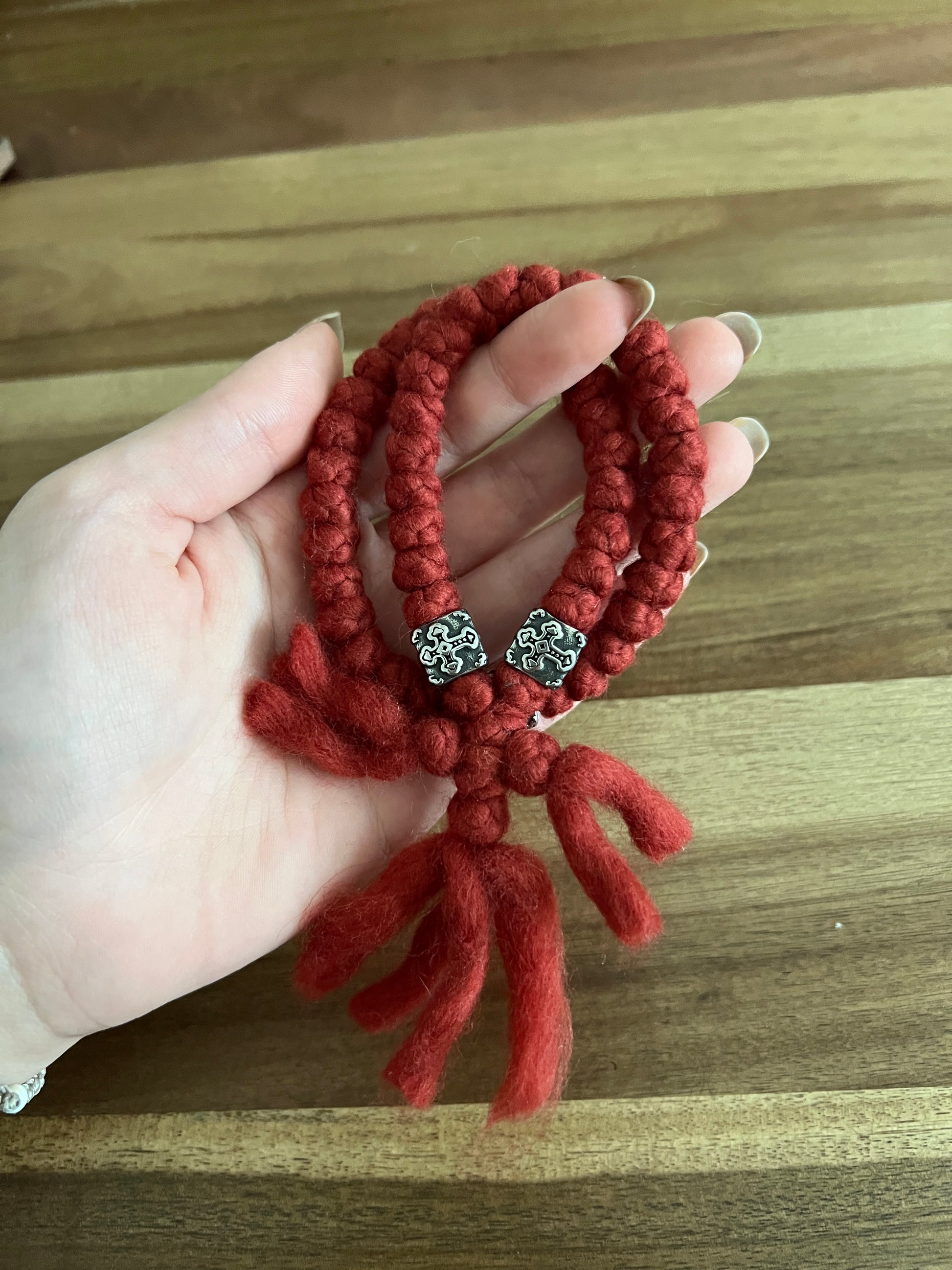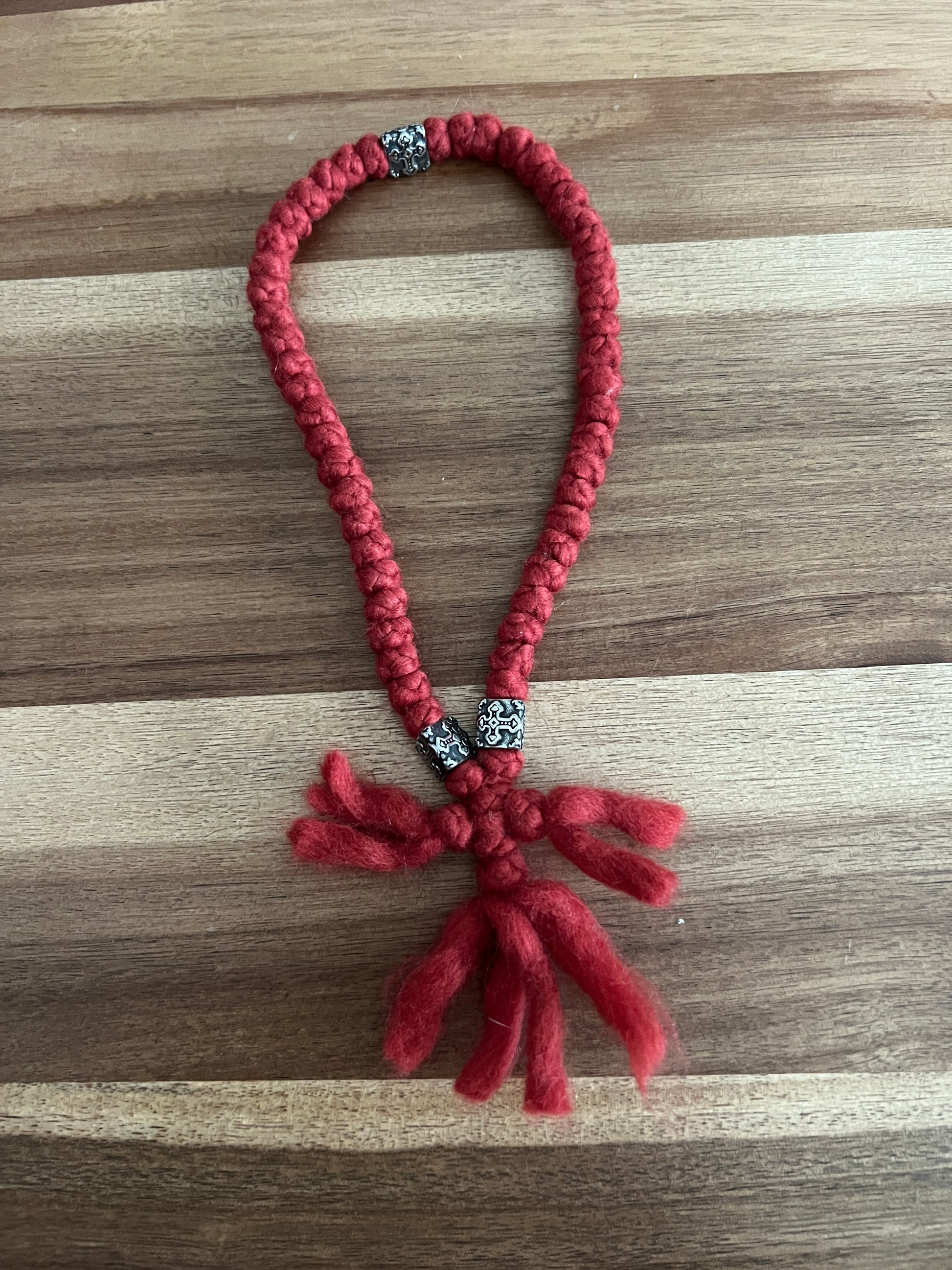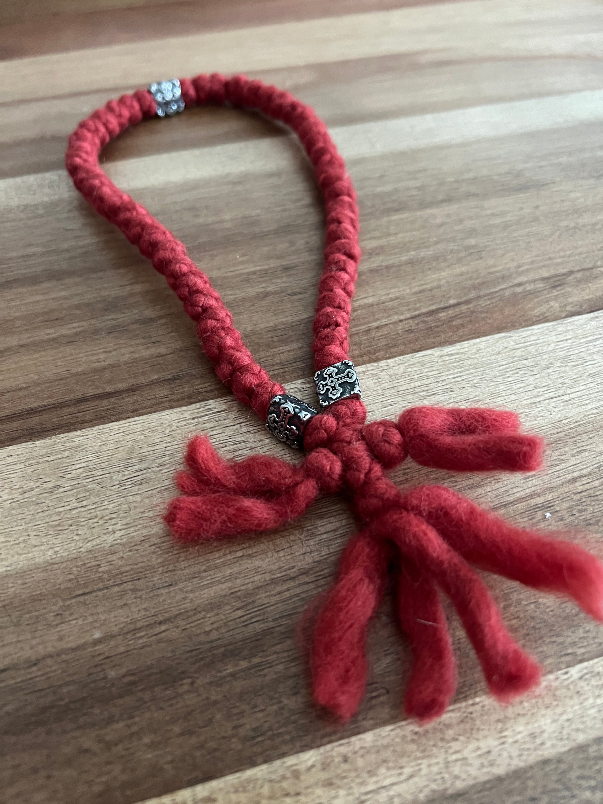 Red Roving Wool 50 Knot Prayer Rope with Silver Spacers
