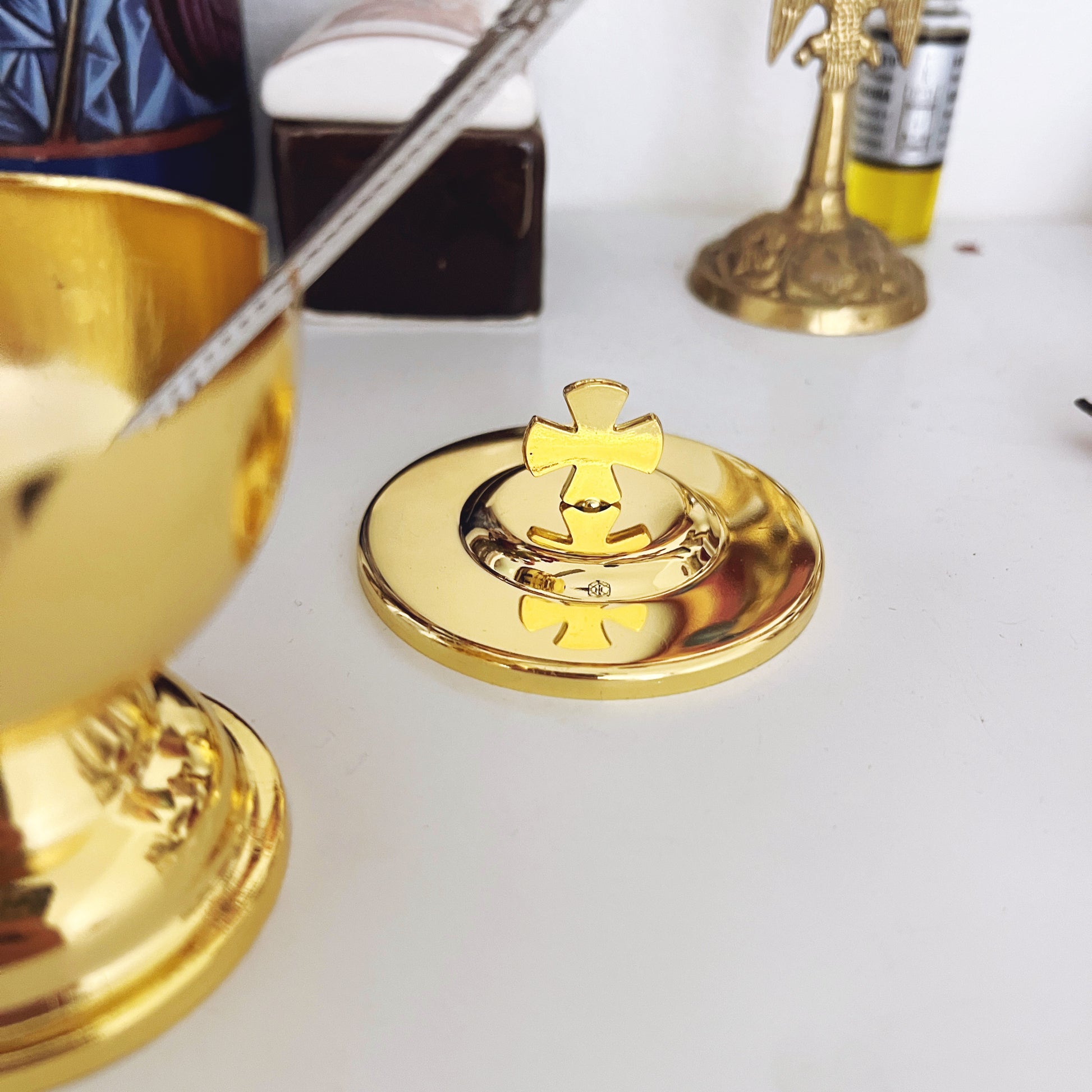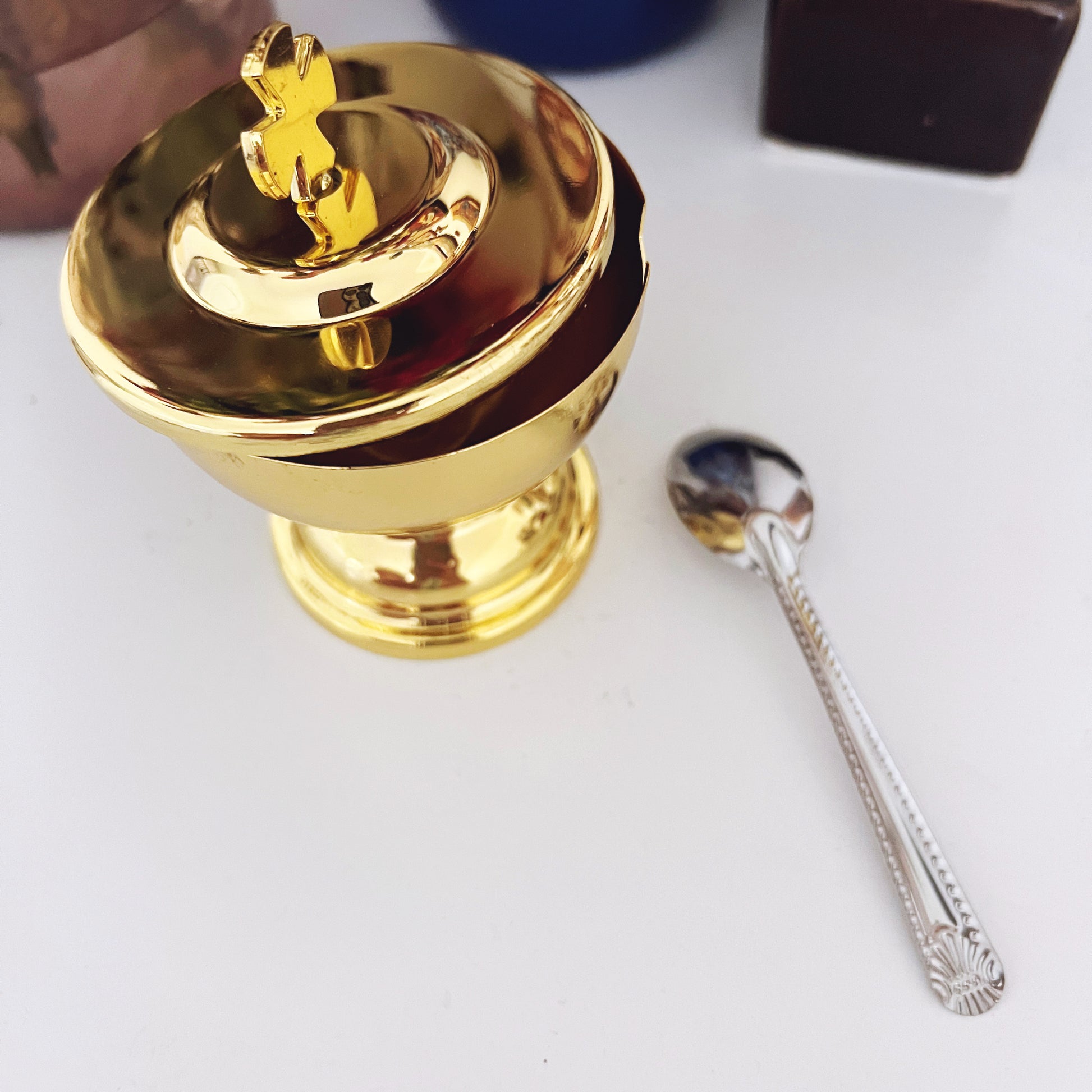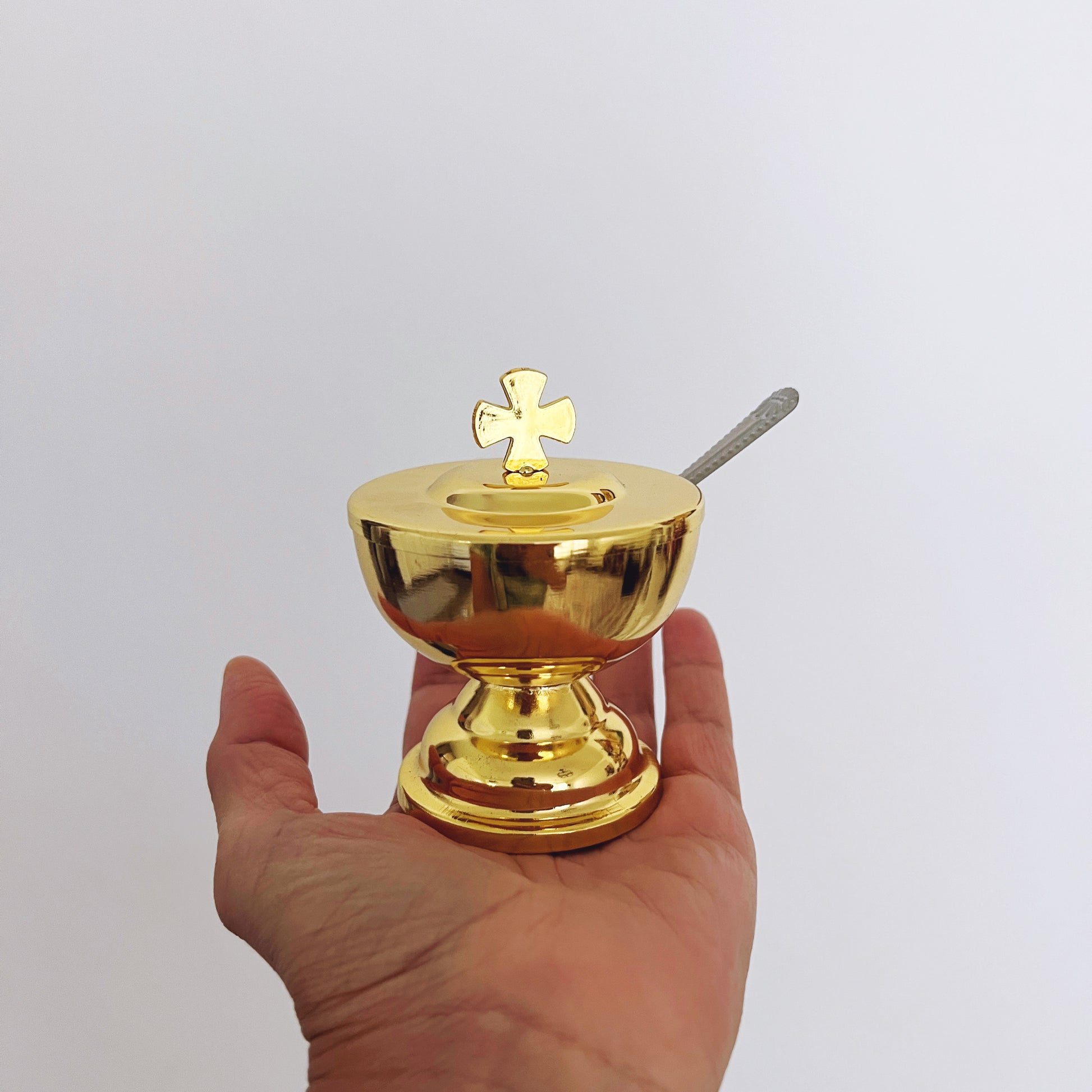 Pequeño incensario dorado para quemar incienso durante la oración. Este incensario incluye una cucharita para recoger el incienso. Es delicado, sencillo y hermoso.