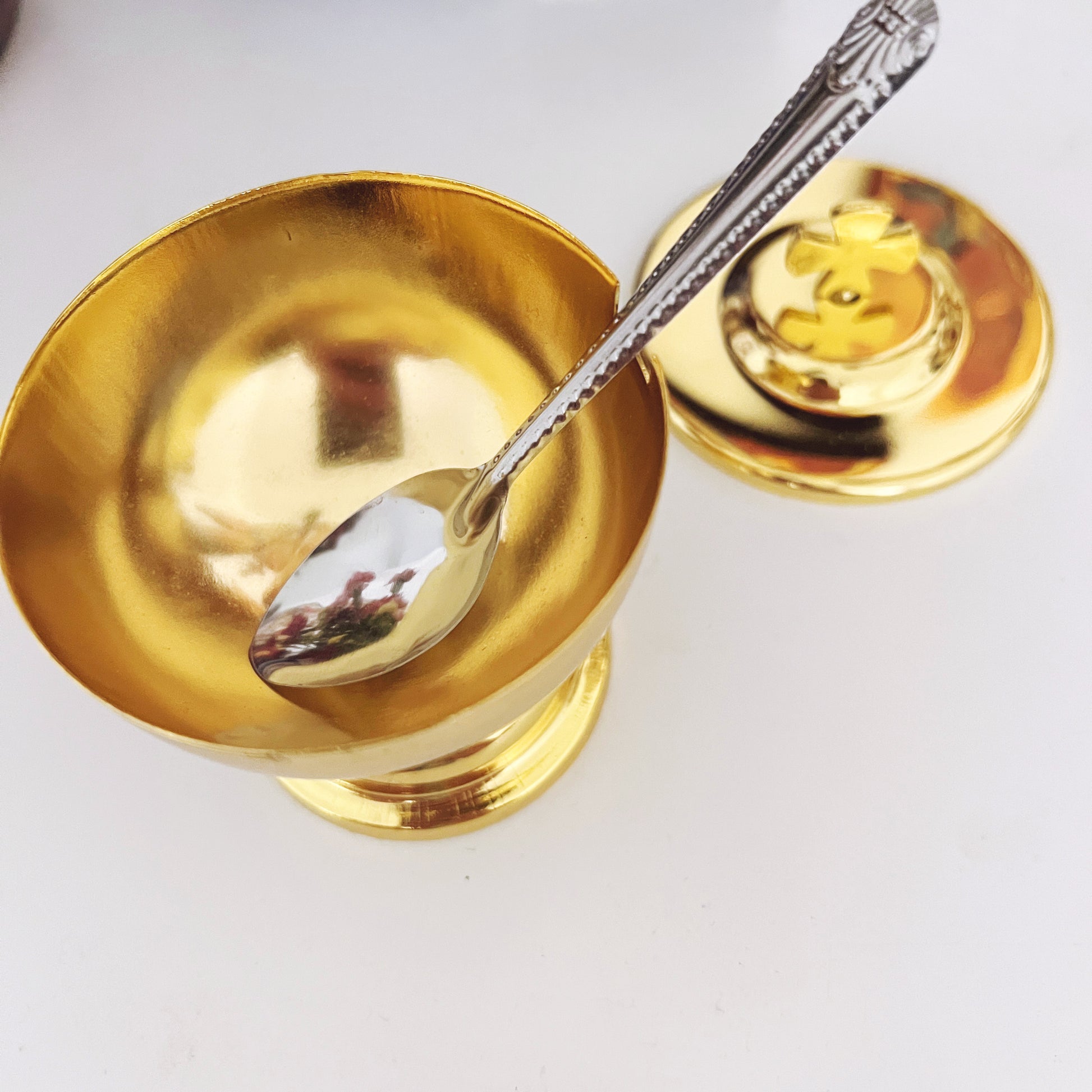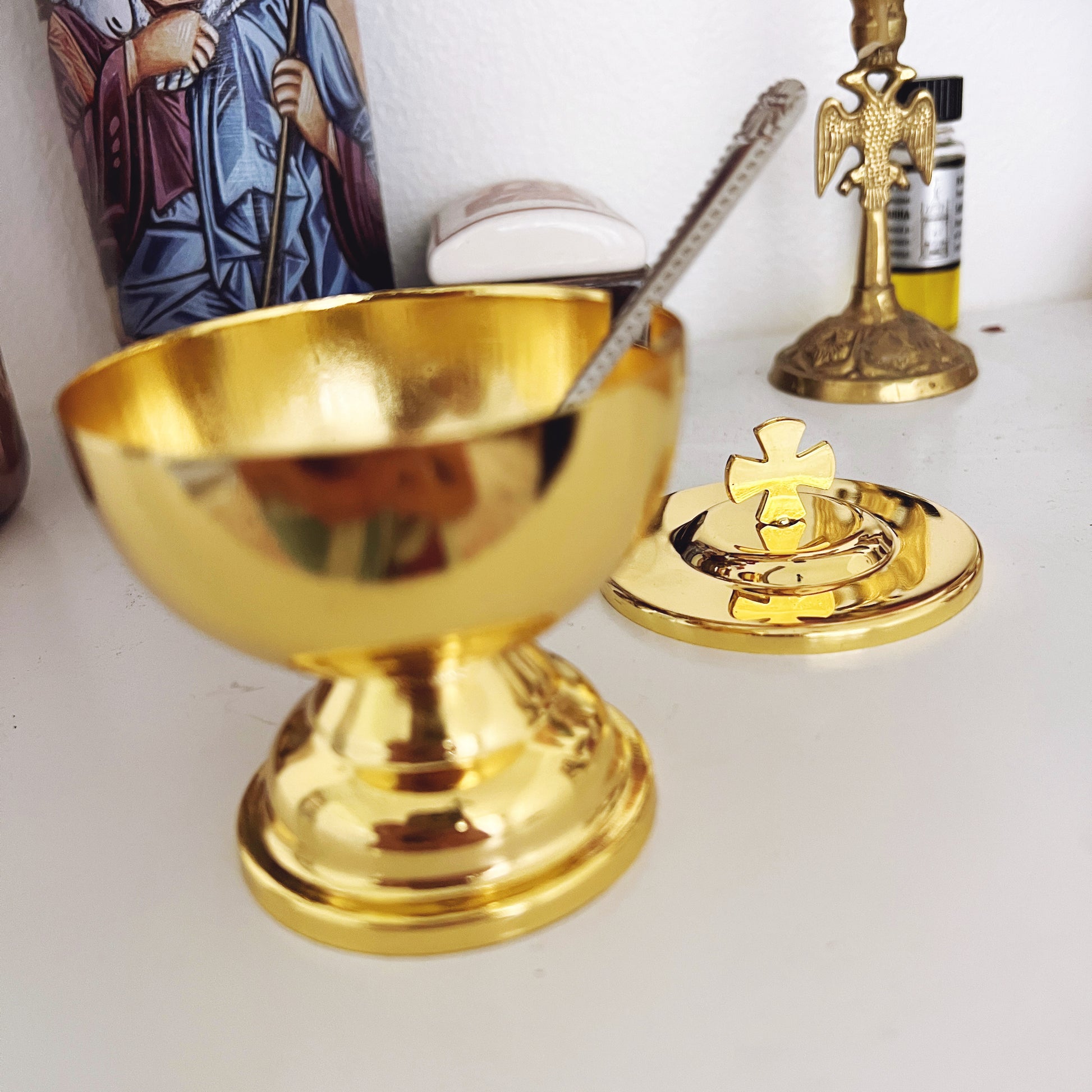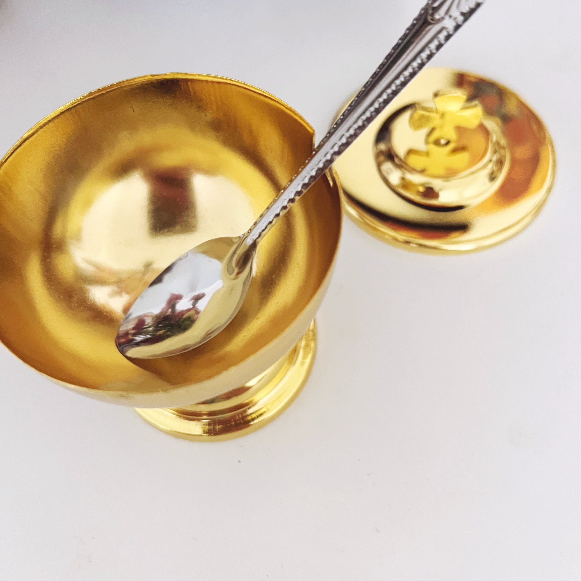 Pequeño incensario dorado para quemar incienso durante la oración. Este incensario incluye una cucharita para recoger el incienso. Es delicado, sencillo y hermoso.