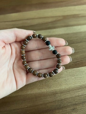 This is a prayer bracelet made to size rather than bead count. It has silver spacers between each bead, black beads to finish it off and a silver cross.