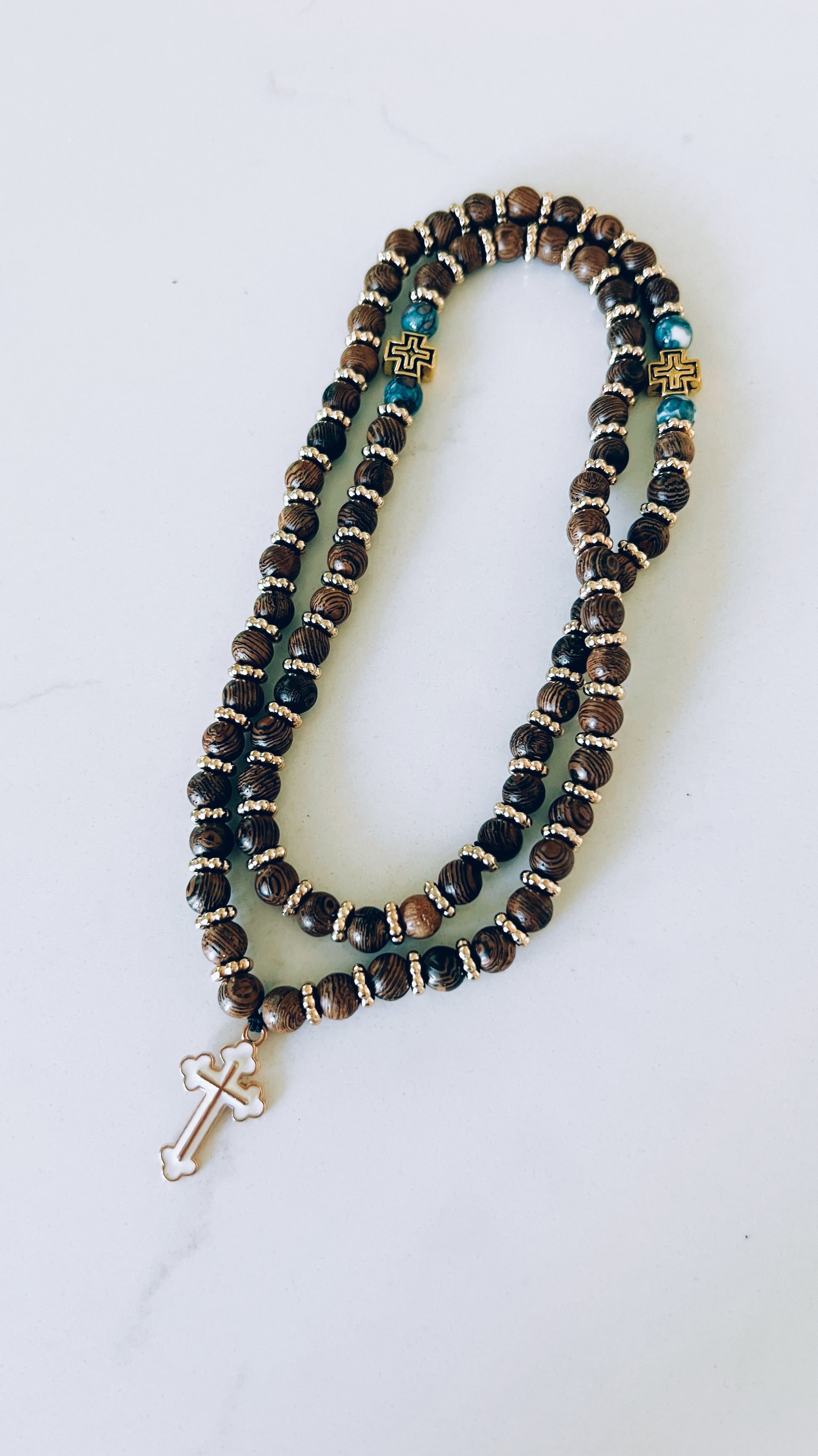 Connect with Christ with our 75 bead prayer bracelet. Prayerfully hand made from high-quality wooden beads and a white enameled cross in the Orthodox Christian style.